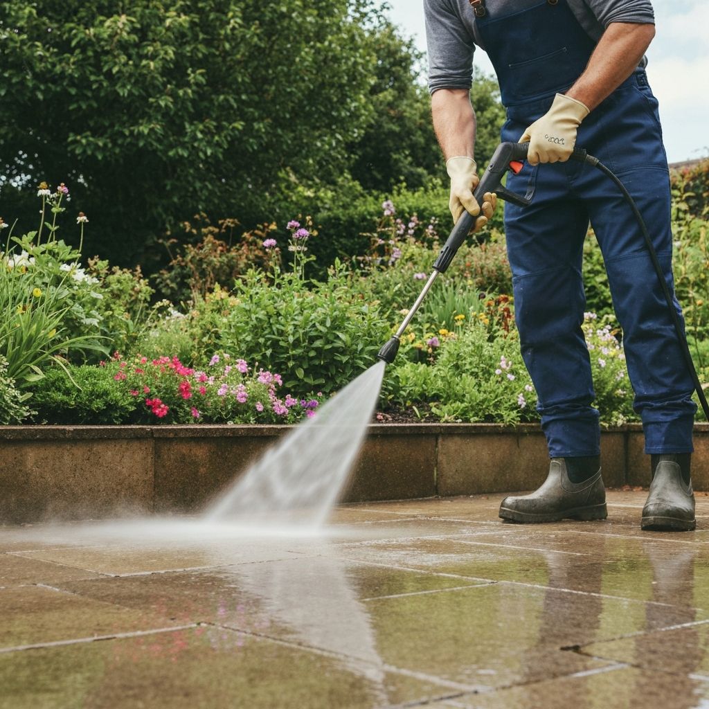 Nettoyage de terrasses, allées et entretien basique des espaces verts attenants.
